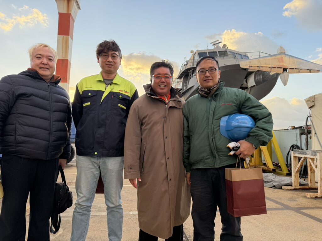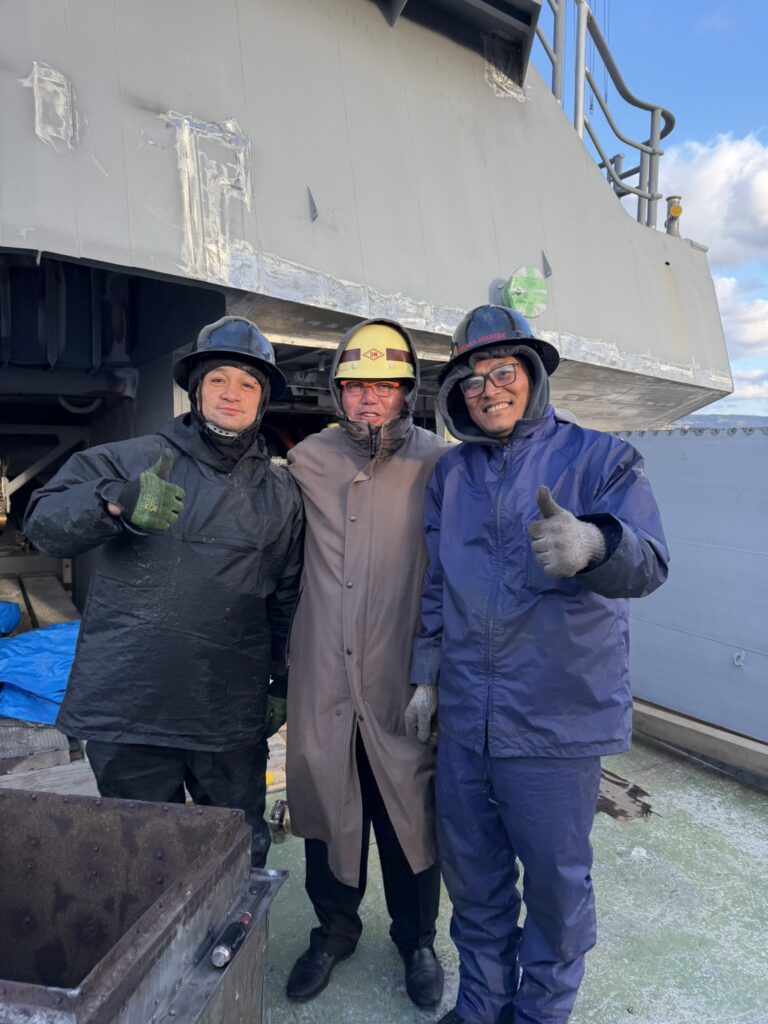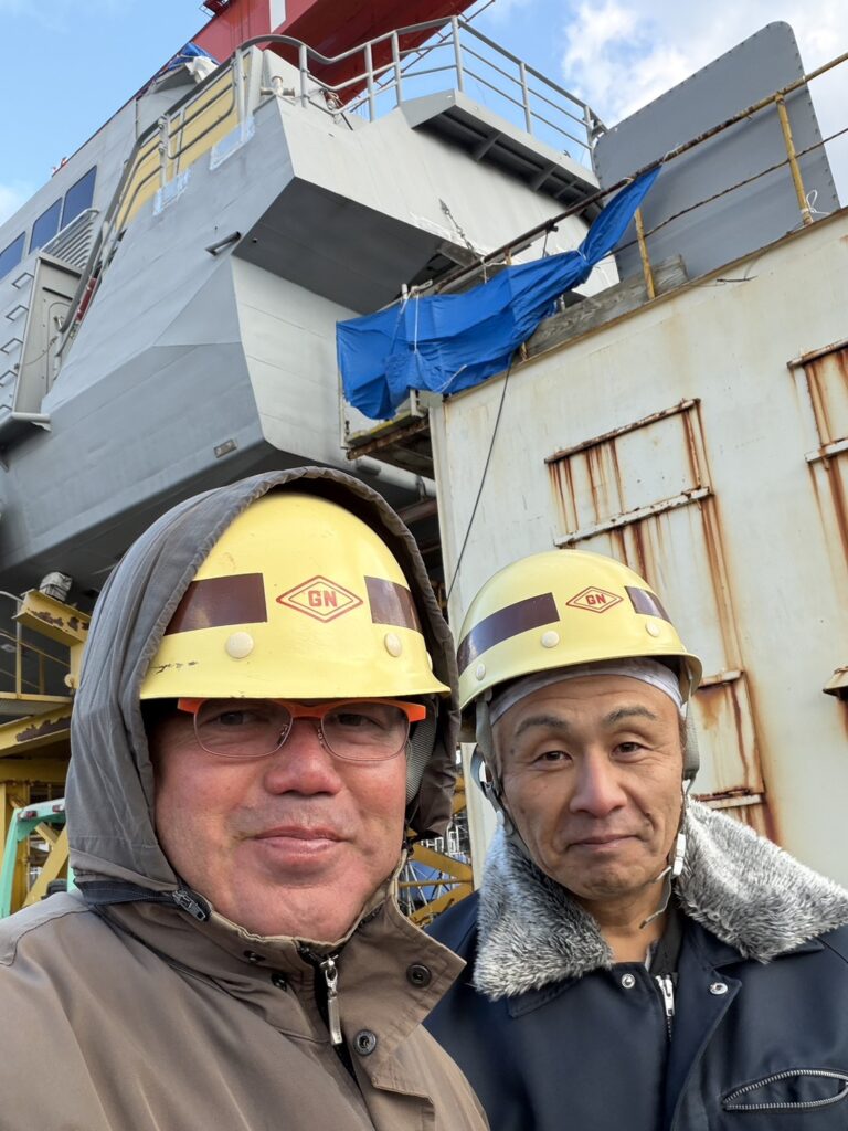 本日、久米島オーシャンジェットの船「つむぎ」の修繕作業をしている佐賀県の名村造船所を訪問し、今年最後となる状況確認と、日々作業にあたっているわが社の社員への激励を行ってまいりました。